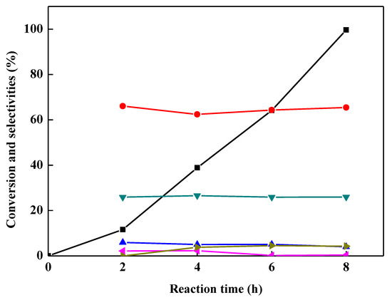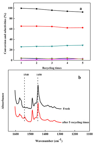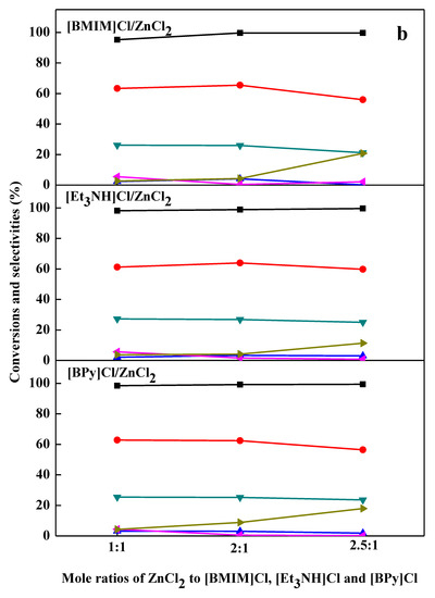 The Lewis acid strength of the ionic liquids was measured according to the blue shift of pyridine infrared (IR) absorption band at ca. 1450 cm−1 and the Brönsted acid amount was determined according to the intensity of the band at ca. 1540 cm−1 [22,26]. For the FT-IR analysis, all the samples were prepared by mixing pyridine and ionic liquid with a volume ratio of 1:1. The FT-IR spectra of the samples were recorded on a FT-IR spectrophotometer (Nicolet Nexus 470, Thermo Fisher Scientific, Waltham, MA, USA) at ambient temperature.