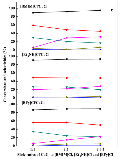 When the [BMIM]Cl-nCuCl, [Et3NH]Cl-nCuCl, and [BPy]Cl-nCuCl ionic liquids were used as the catalysts, after reacting at 80 °C for 8 h, with increasing the n values of the ionic liquids from 1 to 2.5, the conversions of toluene increased from 89.6% to 94.9%, 90.4% to 93.2%, and 86.6% to 89.0%, respectively (Figure 2c). The selectivities of o-chlorotoluene decreased from 58.9% to 44.7%, 48.9% to 47.8%, and 56.2% to 50.1%. The selectivities of p-chlorotoluene decreased from 29.6% to 16.8%, 26.8% to 20.0%, and 34.4% to 21.9%. However, the selectivities of benzyl chloride increased from 6.1% to 31.7%, 20.1% to 27.9%, and 5.8% to 22.4%. The selectivities of m-chlorotoluene and dichlorotoluenes were less than 1.9% and 6.4%, respectively.