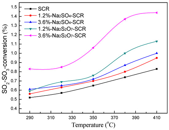 SO2–SO3-conversion for different catalysts at different reaction temperatures are shown in Figure 1. The results indicate that the SO2–SO3-conversion of different catalysts increases gradually with increasing temperature. The SO2–SO3-conversion of the pure catalyst increases from 0.52% at 290 °C to 0.83% at 410 °C. The concentration of SO3 increases from 9.33 ppm to 14.97 ppm. The most significant increase is for the 3.6% Na2S2O7 poisoned catalyst. The SO2–SO3-conversion increases from 0.83% to 1.44% and the concentration of SO3 increases from 15 ppm to 26 ppm. The overall variation of 3.6% Na2SO4 poisoned catalyst is lower than that of 1.2% Na2S2O7.