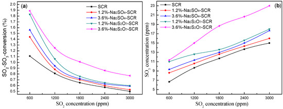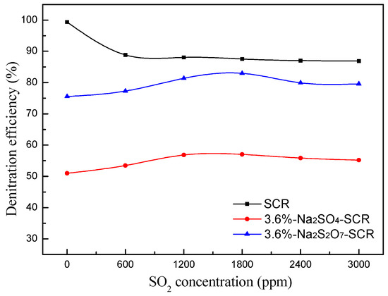 The influence of SO2 concentration on the denitration efficiency of different catalysts is shown in Figure 4. The denitration efficiency of pure catalysts remains approximately constant after initially decreasing from 99.33% to 88%. The 3.6% Na2SO4 and Na2S2O7 poisoned catalysts initially increase before decreasing and then plateauing. The denitration efficiencies (when SO2 concentration is 1800 ppm) of catalysts poisoned with 3.6% Na2SO4 and 3.6% Na2S2O7 reach maximum values of 57.03% and 82.95%, respectively. Wu et al. [32] examined pure catalysts after the introduction of SO2 and found that a large amount of Lewis acid sites on the catalyst surface were covered by ammonium sulfate. This weakened the adsorption of NH3 and NO by the catalyst. Anstrom et al. [33] and Zhu et al. [34] suggested that due to the addition of SO2, NO, and SO2 competed for adsorption on the catalyst surface. This would explain why the adsorption amount of NO was reduced and the denitration efficiency was lowered. For catalysts poisoned with Na salts, Hu et al. [20] concluded that the anions from the sodium salt provided more acidic sites and V–O–S bonds. This was found to promote the catalytic oxidation of SO2 and enhance the adsorption capacity of NH3. Consequently, the denitration efficiency improved. The amount of acid sites on the catalyst surface began to decrease when the concentration of SO2 in the flue gas was increased to a certain extent. The adsorption of SO2 on V2O5 resulted in the formation of an intermediate structure, namely VOSO4. This then reduced the V5+ concentration for the SCR reaction, which caused the denitration efficiency to decrease.