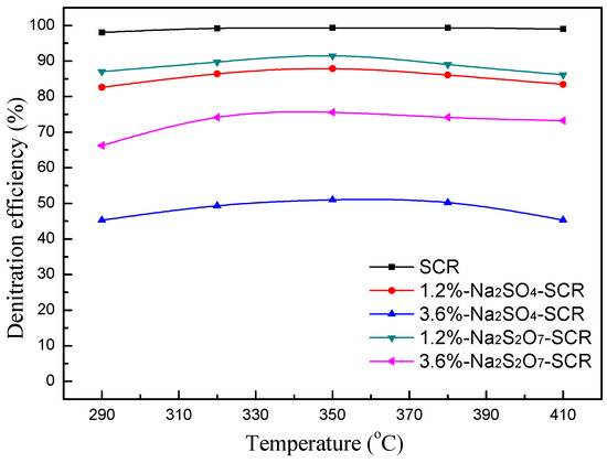 The denitration efficiency curves for different catalysts at different temperatures are shown in Figure 3. The pure catalyst has a wide range of activity temperature and exhibits favorable denitration performance. The efficiency remains above 95% over the entire temperature range considered and reaches 99.33% at 350 °C. The addition of sodium salts results in the deactivation of catalysts. The activity sequence is as follows: SCR > 1.2%-Na2S2O7-SCR > 1.2%-Na2SO4-SCR > 3.6%-Na2S2O7-SCR > 3.6%-Na2SO4-SCR. The denitration efficiency decreases with the increase of sodium salt loading. It initially increases but then decreases with increasing temperature. For 1.2%-Na2SO4-SCR and 1.2%-Na2S2O7-SCR, the denitration efficiency decreases slightly but remains above 80% (reaching 87.86% and 91.49% at 350 °C, respectively). When the loading increases to 3.6%, the denitration efficiencies of Na2S2O7 and Na2SO4 poisoned catalysts drop to 75.57% and 50.97% at 350 °C, respectively. Overall, the degree of poisoning of Na2SO4 is higher than Na2S2O7 under equal loading. Therefore, the degree of poisoning of catalysts is also related to the form of sodium salts used. For instance, S2O72− can provide more Brønsted acid sites and has stronger oxidizability than SO42−. This results in more NH3 being adsorbed which promotes NO reduction [31].