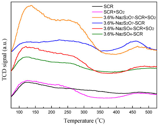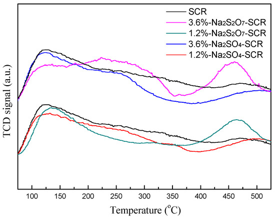 The adsorption capacity of NH3 on the acid sites indicates the activity of the catalyst. Therefore, the NH3-TPD experiment was conducted. The spectrum obtained can indicate the strength and acidity of the acid center. The larger the area of the desorption peak, the higher the corresponding acid concentration. The higher the peak temperature is, the greater the corresponding acid strength will be. Figure 5 shows the NH3-TPD patterns of different catalysts. It is generally believed that the desorption peak below 200 °C corresponds to the desorption of physisorbed NH3, the desorption peak in the range of 200 to 350 °C corresponds to the weakly chemisorbed NH3, and the desorption peak between 350 and 500 °C corresponds to the strongly chemisorbed NH3 [35,36]. For 1.2% and 3.6% Na2SO4 poisoned catalysts, NH3 adsorption decreased most noticeably. For 1.2% and 3.6% Na2S2O7 poisoned catalysts, the amount of physisorbed NH3 reduces between 100 and 200 °C. In contrast, the amount of strongly chemisorbed NH3 significantly increased between 350 to 500 °C. According to Zheng et al. [37], this increase can be attributed to the catalyst surface being sulfated through the addition of Na2S2O7. The traces of these compounds remaining on the surface of catalysts can provide strong acid sites, which is beneficial to the adsorption of NH3. Chang et al. [13] have shown that Na preferentially coordinated on V–OH bonds and V–O–H was replaced by V–O–Na after addition of alkali metals. This resulted in a reduced number of acid sites and lower catalytic activity. The reaction formulas are as follows: