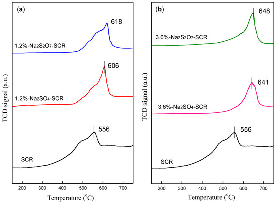 The redox performance of the catalyst accounts for another important factor in catalytic reduction. The lower the temperature corresponding to the reduction peak is, the easier the catalytic redox reaction of the catalyst will be. Peak area represents H2 consumption. To test the impact of sulfur-containing sodium salts poisoned catalysts on the redox performance, the H2-TPR was carried out and the experimental results are shown in Figure 7. The reduction peak temperature of the pure catalysts appeared at 556 °C, which can be attributed to the reduction of V5+ to V3+. After the addition of sodium salts, the reduction peak temperature of the catalysts increased. This indicates that sodium salts poisoned catalysts decreased the oxidizability. Chen et al. [40] suggested that the interaction of sodium salts with V species hindered the release of lattice oxygen in the catalyst, making V species more difficult to be reduced. The temperature shifted towards higher values with the increased loading. However, the reduction peak temperatures of the Na2SO4 and Na2S2O7 poisoned catalysts with the same loading were very similar. The H2 consumptions were 0.251, 0.897, 1.614, 2.690, and 4.698 mmol/g for pure catalyst, 1.2% Na2SO4, 1.2% Na2S2O7, 3.6% Na2SO4, and 3.6% Na2S2O7 poisoned catalyst, respectively. The H2 consumption significantly increases for sodium salts poisoned catalysts. In particular, the Na2S2O7 poisoned catalyst is 1.8 times higher than Na2SO4 poisoned catalyst with the same loading. This is because S2O72− has stronger oxidizability than SO42−.
