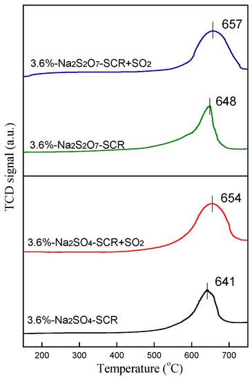 Figure 8 shows the H2-TPR curves of 3.6% Na2SO4 and Na2S2O7 poisoned catalysts when the SO2 concentration is 0 and 1800 ppm. The reduction peak temperature shifted towards the higher end after addition of SO2, which decreased the denitration performance of the catalyst. However, the H2 consumption also increased to 3.120 and 5.129 mmol/g, respectively. Yu et al. [41] considered that the introduction of SO2 made the surface of the poisoned catalyst sulfated, increasing the catalytic performance of the poisoned catalyst. However, this is not the only influence factor for catalytic performance based on catalytic performance results.