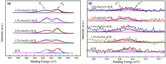 As shown in Figure 9a, the spectra of O1S were divided into two peaks. The peak corresponding to 531.0–531.6 eV was attributed to surface chemical adsorption oxygen (defined as Oα). The peak corresponding to 528.4–528.7 eV was attributed to lattice oxygen (defined as Oβ) [42,43]. The concentration ratio of chemical adsorption oxygen (Oα/(Oα+Oβ)) was computed using peaking software, which is shown in Table 2. The sodium salts poisoned catalysts increased chemical adsorption oxygen content on the catalyst surface. However, for 1.2% and 3.6% Na2SO4 poisoned catalyst the surface oxygen concentration was lower than for other catalysts (see Table 1). Therefore, the chemical adsorption oxygen content of the Na2SO4 poisoned catalyst was low. The chemical adsorption oxygen is very active and is indispensable for oxidation reactions. There is a positive correlation between the oxidative properties of the catalyst and the surface chemically adsorbed oxygen content [44]. Therefore, the relatively high chemically adsorbed oxygen content in the sodium salt poisoned catalysts are beneficial for SO2 oxidation.