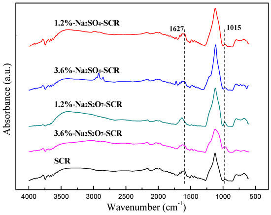 The characteristic peaks of different functional groups on different catalyst surfaces were obtained via FT-IR measurements. The results are shown in Figure 12. These catalysts exhibit two key peaks located at 1015 cm−1 and 1627 cm−1. The peak at 1015 cm−1 is attributed to the terminal vanadium oxy group (V5+=O) [49]. The peak at 1627 cm−1 is attributed to the Lewis acid sites [50]. According to the experimental results, the sodium salts poisoned catalyst was found to have reduced the Lewis acid sites. With increased loading, the degree of reduction increased. This indicates that the weak acidic strength of the catalyst surface was lowered. This is consistent with the results of NH3-TPD. The peak intensity at 1015 cm−1 increased and Na2S2O7 poisoned catalyst had the most significant effect. The increase of V5+=O bond strength is beneficial for promoting the conversion of SO2 to SO3 [51]. Alvarez et al. [18] suggested that the presence of pyrosulfates would maintain the high oxidizability of V species to a certain degree. This result is consistent with the results of SO2 oxidation experiments.