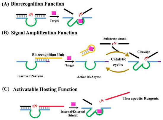 The attractive superiority and versatility of RNA-cleaving DNAzymes (RCDs) have catalyzed the emergence of RCDs-based functional probes for diverse applications both in vitro and in vivo. However, for diagnostic or therapeutic purposes, and especially for intracellular and in vivo applications, it is essential to illustrate the general concept of translating RNA-cleaving DNAzymes into functional probes. In general, according to the functions of RNA-cleaving DNAzymes, DNAzyme-based probes can be categorized into three types: biorecognition agents, signal amplification agents, and activatable hosting agents as shown in Figure 3.