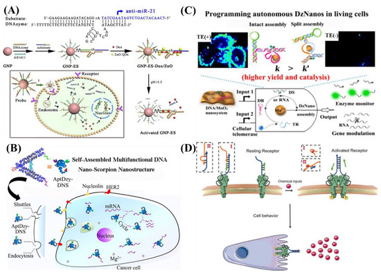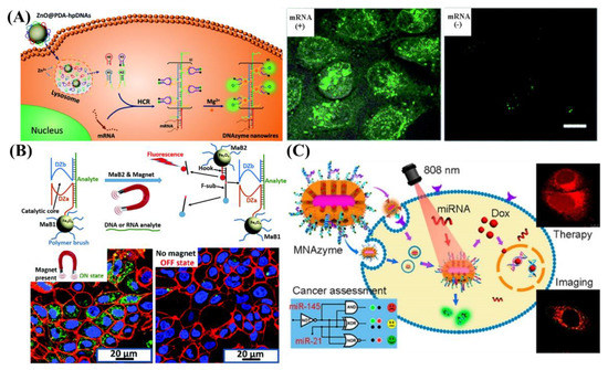 Another important type of RNA is microRNA (miRNA), which serve as key regulators in gene expression networks [53]. Compared with mRNA, miRNAs are generally much shorter (approximately 19−23 nucleotides), and contain more variants; therefore, the development of sensitive and selective RCDs-based probes for miRNA imaging is highly challenging but desirable [54]. Zhang et al. [55] developed a multicomponent nucleic acid enzyme-based nanodevice consisting of split DNAzymes and mesoporous silica-coated gold nanorods (Figure 5C), which enables stringent recognition and in situ amplification for multiplexed intracellular imaging. The integration of miRNA profiling techniques with nanomaterials provides a general strategy for programmable logic operations, intracellular imaging, and controlled drug release, indicating great promise for the prognosis and diagnosis of disease, as well as the combinational treatment of chemotherapy and gene therapy. Using the RCDs-based functional probes, a series of miRNAs, including miR-21 [55,56,57,58,59], miR-145 [55], miR-141 [60], and miR-10b [61], have been successfully imaged in living cells [62].