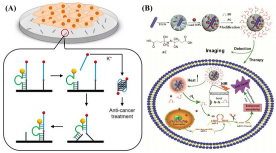 To overcome therapeutic resistance, an RCDs-based combinational therapeutic strategy was recently reported by Sun et al. [85], in which mesoporous silica-coated gold nanorods were functionalized with a survivin DNAzyme using a thermal-sensitive small molecule to cap the anticancer DOX drug (Figure 8B). This nanosystem showed the NIR-light-activated release of both the anticancer DOX drug and the survivin DNAzyme, resulting in enhanced combinational photothermal therapy, chemotherapy, and gene therapy. Another innovative method for cancer therapy was reported by Yu et al. [86], in which Mg2+-dependent DNAzyme was used as a gatekeeper and trigger for the controlled release of encapsulated therapeutic agents in hollow mesoporous magnesium silicate nanoparticles (HMMSNs). The HMMSNs showed a pH-accelerated biodegradation property, and can be easily excreted via feces and urine, guaranteeing their further clinical translation.