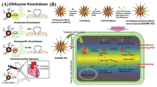 Representative examples of in vivo gene regulation based on RNA-cleaving DNAzymes. (A) In vivo knockdown of TNF-α by DNAzyme–gold nanoparticles as an anti-inflammatory therapy for myocardial infarction. Reprinted with permission from reference [88]. Copyright 2016 Elsevier. (B) Synthesis of the glutathione-activatable and O2/Mn2+-evolving DNAzyme-based nanocomposite for photodynamic therapy and gene silencing inside cancer cells. Reprinted with permission from reference [90]. Copyright 2017 Wiley-VCH.