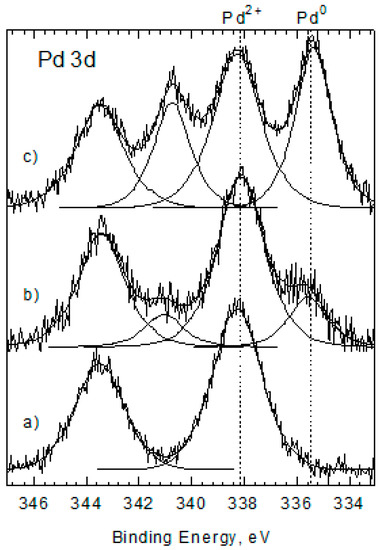 It was expected that Pd/DNA contained Pd(II) bonded to functional groups of DNA and the XPS method was used in order to confirm oxidation state of palladium. However, the XPS analysis of Pd/DNA (C1,C2) showed Pd 3d spectra (Figure 1) characterized by the typical two spin-orbit components Pd (3d5/2) and Pd (3d3/2) separated by approximately 5.4 eV. Figure 1b,c shows a Pd 3d line deconvoluted into two doublets attributed to two different chemical species, Pd(0) and Pd(II). The first peak centered at 335.5 ± 0.1 eV (3d5/2) corresponded to Pd(0) [12]. The second peak centered at 338.2 eV (3d5/2) corresponded to Pd(II) with binding energy exactly the same as in the primary form of palladium in Pd(OAc)2 (Figure 1a). The calculated content of Pd(0) present in the catalysts prepared at RT (C1) and at 80 °C (C2) was 20% and 45%, respectively.