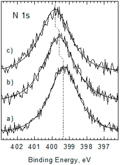 N 1s core level spectra for DNA surface (as reference) (a), Pd/DNA (C1) prepared at RT (b), and Pd/DNA (C2) prepared at 80 °C (c).