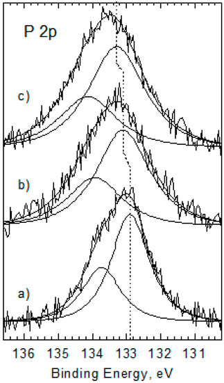 P 2p core level spectra for DNA surface (as reference) (a), Pd/DNA (C1) prepared at RT (b), and Pd/DNA (C2) prepared at 80 °C (c).