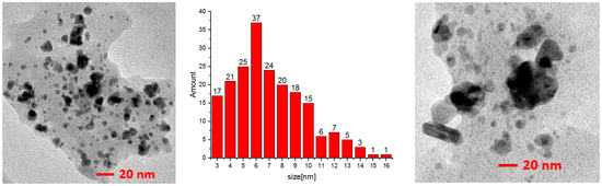 The next synthetic method was different from the previous one in only one respect. The amount of Pd(OAc)2 used for the preparation of C3 Pd/DNA was reduced by half (to 56 mg). Interestingly, this resulted in a decrease in the Pd NP size to 4–7 nm, and the size distribution became narrower (Figure 8).