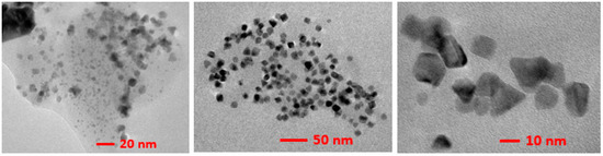 When PdCl2 was used instead of Pd(OAc)2 for the preparation of C4 Pd/DNA, nanoparticles of well-defined shapes were obtained. In Figure 9, nanoparticles prepared in this manner appear in triangular, cubic, and unidentified shapes. The size of most of the nanoparticles ranged between 9 and 12 nm (Figure 9).