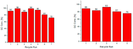 Recyclability is one of the desired properties of supported catalysts [36]. The recycling potential of Pd/DNA was therefore investigated. For this purpose, a reaction was implemented between 4-bromobenzaldehyde and phenylboronic acid with 1 mol% and 0.5 mol% of Pd. At the end of the catalytic reaction, the organic products were separated by extraction, and the catalyst was recovered for the next run by simple phase separation. After the first run, the palladium content in the reaction solution was determined as 0.152 ppm. Such a low amount of palladium evidenced its negligible leaching from the DNA support. In our study, Pd/DNA was recycled for seven consecutive runs with 1mol% of Pd (Figure 11) and five consecutive runs with 0.5 mol% of Pd (Figure 11). Although some conversion decrease was observed during recycling, the stability of Pd/DNA, at least in five runs, was quite satisfactory.