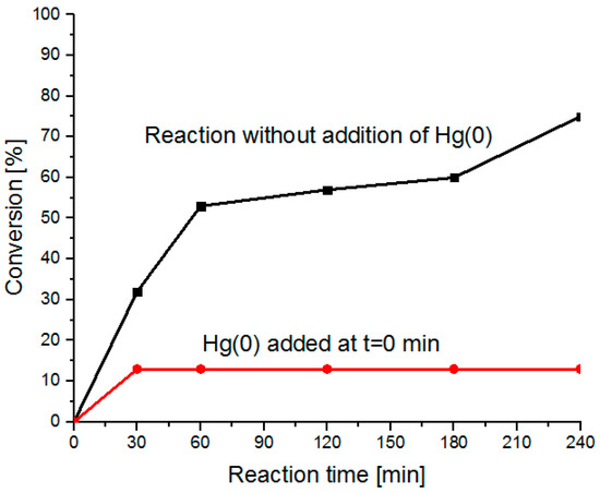 The above-reported results made it possible to propose a heterogeneous reaction pathway with the performance of the catalytic reaction on the surface of Pd NPs supported on DNA. In order to confirm this assumption, the catalytic reaction was performed in the presence of an Hg(0) inhibitor which can amalgamate Pd NPs, blocking their activity [37,38,39]. When Hg(0) was added to the catalytic system together with the substrates, the conversion of 2-bromotoluene was 13% (Table 3, entry 2). When Hg(0) was added 30 min later, the conversion was 53% (Table 3, entry 3). Thus, the presence of Hg(0) resulted in decrease of the reaction yield.