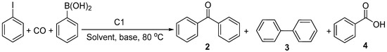 The carbonylative Suzuki coupling was studied using the catalyst C1. For this purpose, the coupling of iodobenzene (PhI) and phenylboronic acid (PhB(OH)2) carried out under CO atmosphere was selected as a model reaction (Scheme 3, Table 4). Regardless of all attempts to optimize the conditions, only a limited amount of benzophenone, max. 35%, could be produced in this system (also see Table S3).