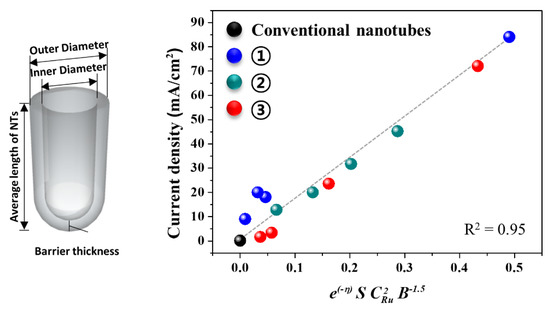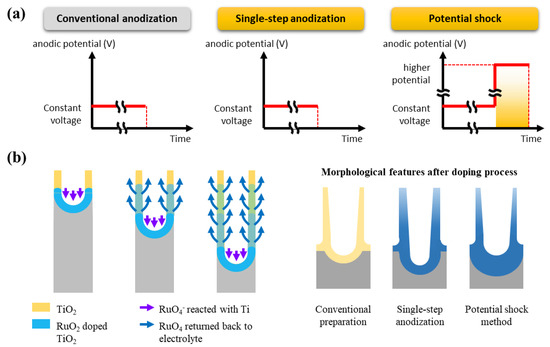 - Yoo, H.; Oh, K.; Lee, G.; Choi, J. RuO2-doped Anodic TiO2 nanotubes for water oxidation: Single-step anodization vs potential shock method. J. Electrochem. Soc. 2017, 164, H104–H111. [Google Scholar] [CrossRef]