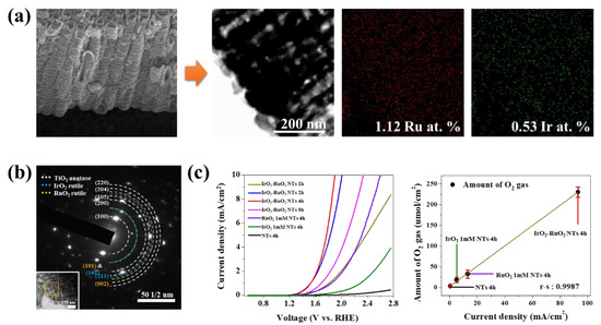- Yoo, H.; Oh, K.; Lee, Y.R.; Row, K.H.; Lee, G.; Choi, J. Simultaneous co-doping of RuO2 and IrO2 into anodic TiO2 nanotubes: A binary catalysts for electrochemical water splitting. Int. J. Hydrogen Energy 2017, 42, 6657–6664. [Google Scholar] [CrossRef]
