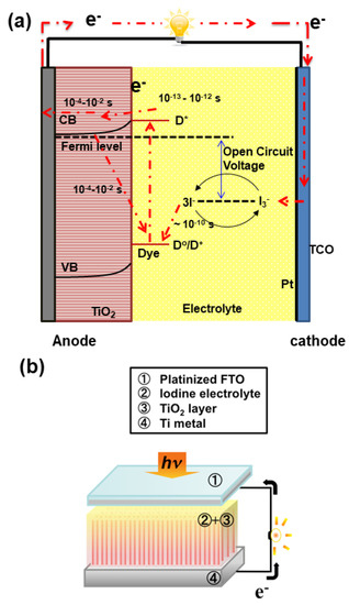 - Tachibana, Y.; Moser, J.E.; Grätzel, M.; Klug, D.R.; Durrant, J.R. Subpicosecond interfacial charge separation in dye-sensitized nanocrystalline titanium dioxide films. J. Phys. Chem. 1996, 100, 20056–20062. [Google Scholar] [CrossRef]