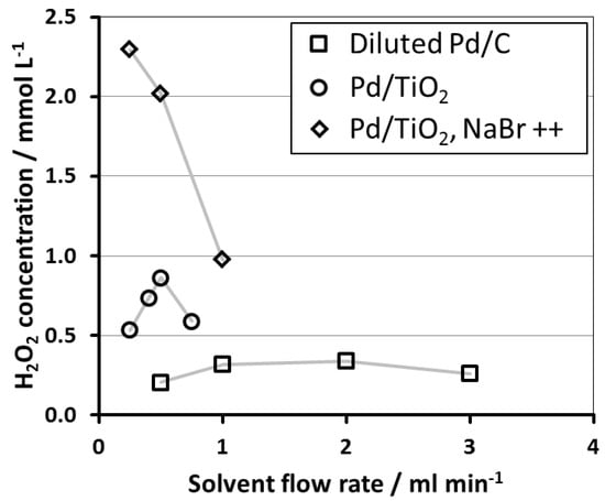 The initial experiments were conducted using diluted Pd/C as catalyst in a fixed bed within the micro channel, performing the reaction in water as solvent (0.15 mM NaBr, 0.15 mM H2SO4) at 20 bars with undiluted reactant gases and solvent flow rates from 0.5 to 3 mLmin (Table 1, Exp.-Nr.: 1–12 and empty squares in Figure 1a). The H2O2 concentration was found to be increasing with decreasing solvent flow rate until a maximum concentration with a yield of 2% was reached. Further decrease of solvent flow rate led to decreasing product concentrations. The increase in concentration with decreasing flow rate at high solvent flow rates can be explained by a diffusion limitation introduced by the gas transport through the membrane and by liquid phase diffusion from the membrane to the bulk of the liquid. The decrease at lower solvent flow rates can only be caused by acceleration of H2O2 decomposition and hydrogenation since concentration of both reactants should increase equally. The acceleration of consecutive reactions can be a result of an unfavorable reactant concentration ratio caused by long residence times beneath the gas chambers and by longer catalyst contact times. For comparison, the 1 wt.-% Pd/TiO2 catalyst was prepared and tested at similar conditions as it had shown promising results in the literature [51]. Pd/TiO2 displayed the same behavior but was able to achieve a higher maximum concentration at a lower solvent flow rate with a maximum yield of 5%. Hence, acceleration of the consecutive reactions was not as severe as with the Pd/C catalyst but still limiting. In order to further stabilize the formed H2O2, the NaBr concentration was increased from 0.15 mM to 4 mM. With the increased NaBr concentration, it was possible to lift the yield to a maximum of 14% using the Pd/TiO2 catalyst. However, the behavior of accelerated consecutive reactions with decreasing solvent flow rate was also observed in this set of experiments.