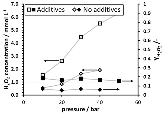 The influence of the system pressure was studied using a Pd/TiO2 coating and by varying the pressure in the overall system between 10 and 50 bars at a partial pressure ratio of 1 (Exp.-Nr.: 29–33 and Figure 4). The Pd/TiO2 coating was used because of the easier implementation in the micro channel and the easier pressure control since pressure drop is lower in comparison to a fixed bed. The H2O2 concentration is increasing linearly with increasing pressure to a maximum of 6.5 mM at 50 bars. A yield between 15 and 18% for all pressures was observed. After 50 hours of operation, the activity of the catalyst started to decline until no more H2O2 was produced after 90 hours. To check for possible leaching or mechanical removal of particles, the experiment was repeated without additives (Exp.-Nr.: 34–37 and Figure 4). A linear dependence on the pressure and a stable yield was observed, similar to the experiment using stabilizers. A lower product concentration and a yield of 5 to 6% indicate a lower selectivity when no stabilizers are added to the solvent. Still, it was shown that keeping the partial pressure ratios constant and increasing the overall system pressure does not affect the catalyst selectivity as claimed in the literature by several research groups [40,47,49,58]. This shows that the productivity of our reactor can be scaled linearly with overall pressure and partial pressure of the reactants.