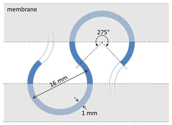 The meander shape was constructed by connecting twenty 275° circle segments with a diameter of 16 mm in the channel center to form a channel with a total length of 768 mm. From each circle segment, 180° is in contact with the membrane resulting in a membrane contact length per segment of 25 mm. Due to the wall between the gas chambers, a length of 13 mm is not in contact with the membrane between the circle segments. Channels with varying depth were used in this work: a single channel with a depth of 0.5 mm, a single channel with a depth of 0.125 mm and three parallel channels with depths of 0.125 mm. All channels had a total length of 768 mm and a width of 1 mm. The geometry is illustrated in Figure 8.