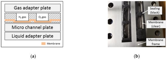 Scheme of the microchannel membrane reactor (a) and photo of the plates forming the actual device (from left to right): liquid adapter plate, micro channel plate, membrane frame bottom, membrane frame top including gas chambers and gas adapter plate (b). Adapted from Ref. [57].