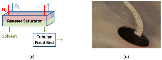 Commercial 5 wt.-% Pd/C (75992, Sigma-Aldrich, St. Louis, MO, USA) and self-prepared 1 wt.-% Pd/TiO2 were chosen as catalysts for the reaction since both had shown high selectivity and reaction rates according to the literature [51,55,65]. Pd/TiO2 was prepared according to a reported wet impregnation method [51]. The procedure as well as catalyst characterization was reported previously [30]. Three different catalyst arrangements were tested. The 5 wt.-% Pd/C was diluted with active carbon (242276 Sigma-Aldrich, St. Louis, MO, USA) in a ratio of 1:9, pressed, crushed and sieved to a fraction of 100 to 250 μm, and finally 200 mg of this mixture was filled in the micro channel to form a fixed bed. Also, 200 mg of Pd/TiO2 was sieved to 100 to 250 μm and tested as a fixed bed in the channel. Glass wool was placed in the tube leading to and from the micro channel to hold the catalysts in place. Pd/TiO2 was also tested as a coating. For this, Pd/TiO2 was ground, stirred in acetone, and then added to the micro channel using a pipette. After drying, the particles were stuck to the walls of the micro channel. Under experimental conditions, the layer was found to give stable reaction rates over a time period of 2 days, afterwards, particle discharge led to rapidly declining activity. Lastly, a tubular fixed bed was prepared by sandwiching 50, 100 and 200 mg of 1 wt.-% Pd/TiO2 sieved to 100 to 250 μm with glass wool in a 6 mm PVC tube. The tubular fixed bed was applied as a third option for catalyst integration since pressure control of the micro channel fixed bed was challenging and led to numerous membrane lift offs due to the high pressure drop, and catalyst discharge was found to occur when the catalyst coating was used. A photo or illustration of each catalyst arrangement is shown in Figure 11.