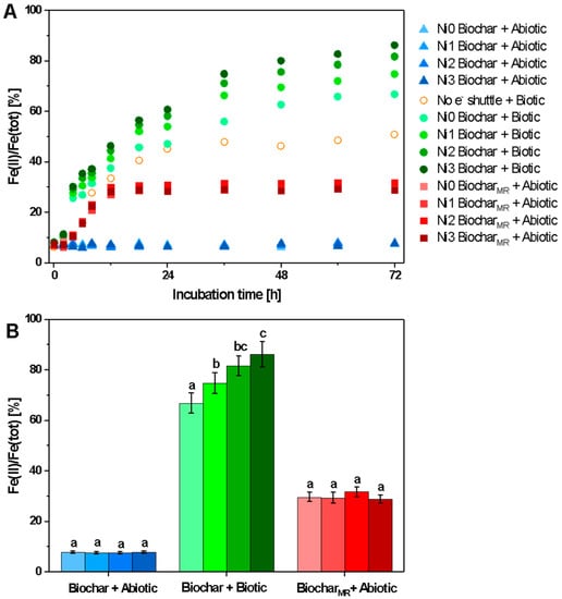 Reduction of ferrihydrite by S. oneidensis MR-1. (A) Formation curves of Fe(II) in bottles amended with different Ni-level biochars. (B) Fe(II) formation in bottles amended with different Ni-level biochars within 72 h. “Biotic” and “abiotic” indicate setups with and without MR-1 cells added, respectively. “BiocharMR” indicates biochar after 72 h of microbial reduction by S. oneidensis MR-1. Ni0, Ni1, Ni2, and Ni3 indicate 0.09 g kg−1, 494 g kg−1, 1156 g kg−1 and 1641 g kg−1, respectively, of Ni in biochars (See Table 1). In (B), means followed by the same lowercase letter for each setup are not significantly different at p < 0.05 (t-test).