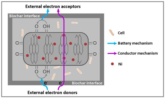 Considering the positive association of the catalyzed effectiveness of biochars in the microbial reduction of Fe(III) minerals through their conductor and redox mechanisms, we expect the produced biochars to be rapid in directly transferring electrons and in the charging and discharging cycles of their surface redox-active functional groups. A study has demonstrated that the low H/C and O/C ratios of biochars enhance the conductor mechanism [] by which electrons can be directly and rapidly transferred from cells to the terminal electron acceptors. Although the features of the elemental composition of biochars can be fine-tuned by adjusting the pyrolysis conditions (e.g., heating rate and temperature) [,], this study revealed that a high Ni level of the precursor can remarkably enhance the conductor mechanism of the produced biochars. Thus, future efforts should focus on the search for natural plants with high capacities to absorb Ni. Such plants can be used not only to remove Ni from Ni-contaminated environmental matrices through phytoremediation, but also to promote the wide application of biochars in environmental remediation through their prominent conductor mechanism-induced electron transfer functionality.