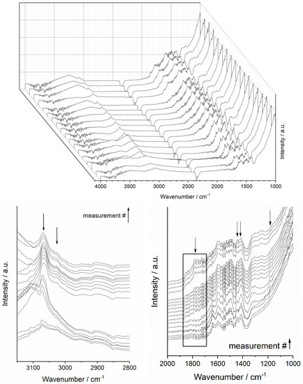 In the literature, Tsou et al. observed an oscillating effect during the oxidation of methylisobutylketone (MIBK) over a Pt/HFAU catalyst at fixed temperatures for 3 h [26,27]. They claimed that the oscillating effect is caused by the oxidation of the active coke molecules adsorbed onto the surface and into the pores of the used catalyst. Bychkov et al. [21] also suggested the deposition/desorption of carbonaceous compounds on the catalysts’ surfaces is directly related to a self-oscillatory process they investigated in the oxidation of methane and ethane. Along with Deng et al. [15] and Zhang et al. [16], they additionally correlated the oscillatory behaviour to changes in the oxidation state of active phase constituents. Therefore, and for a better understanding of changes occurring at the surface of the catalyst, it was inevitable to conduct operando DRIFT measurements throughout the whole duration of the catalytic test. These experiments would provide insight into changes caused by the constant exposure to pollutants at low conversion rates.