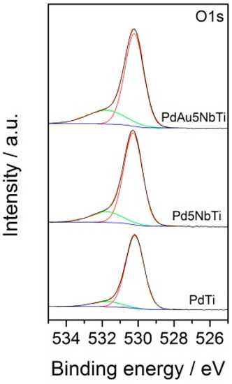 XPS experiments were conducted on all doped and undoped, mono and bimetallic samples to evaluate the chemical composition of the catalysts’ surfaces. Again, for the sake of clarity, only the O1s XPS spectra of niobium-doped samples will be presented, the remaining results are provided as supporting information. Spectra shown in Figure 3 and values calculated in Table 1 show an increase in atomic oxygen yields after doping with niobium. Peak positions reveal two types of oxygen species: OI at low BE values, assigned to lattice oxygen (), and OII, at high BE values, ascribed to surface adsorbed or chemisorbed oxygen ( or ), -OH groups, and oxygen vacancies. The amount of OII species nearly triples in the PdAu5NbTi catalyst compared to the undoped titania catalyst (Table 1). Therefore, adding niobium enhances the presence of oxygen vacancies. The amount of OII is the highest in the bimetallic catalyst. Therefore, the presence of both gold and niobium enhance the amount of OII species. As for the importance of such high amounts of OII, studies by Fronzi et al. [28] and Schaub et al. [29] reveal that the interaction of OII species with molecular oxygen or water provokes the generation of peroxides, superoxides, and hydroxyl species, thus facilitating the dissociation of adsorbates. This claim has been confirmed by Hernandez et al. [30], who explained that an increase in OII species in their Cu-modified cryptomelane oxide rendered the catalyst more efficient in the oxidation of CO.