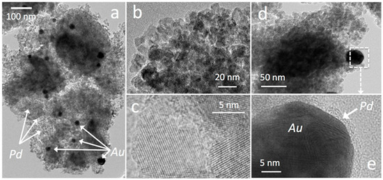 Typical TEM images of the bimetallic PdAu-loaded catalysts were acquired and are shown in Figure 4. The TiO2 support (in grey on the figures) appears in the form of aggregated grains on which metal nanoparticles are deposited (dark spots, Figure 4a). Pictures taken at high magnification show that the size of the individual TiO2 grains is of the order of 10–20 nm (Figure 4b) and their crystalline nature (anatase) is confirmed by the plans clearly observed at high resolution (Figure 4c). The coupling of the TEM images’ recording with EDS analysis indicates that the big dark spots with diameters varying between 20 and 50 nm correspond predominantly to gold nanoparticles, whereas palladium is much better dispersed, being present all over the support as nanoparticles with sizes below 5 nm (Figure 4a). EDS measurements also confirmed the good dispersion of the promoting agents that were homogeneously detected on the support. For all bimetallic samples, the EDS study showed that the two metals were dispersed separately, in agreement with XPS analysis of the bimetallic samples that proved the existence of metallic gold particles, with no proof of the presence of alloys. Nevertheless, TEM/EDS images of the bimetallic samples revealed the presence of Pd-Au core-shell layouts, palladium forming a shell around the gold nanoparticles. This is in line with the order of metal addition during stepwise samples preparations, gold being added first, followed by palladium impregnation.