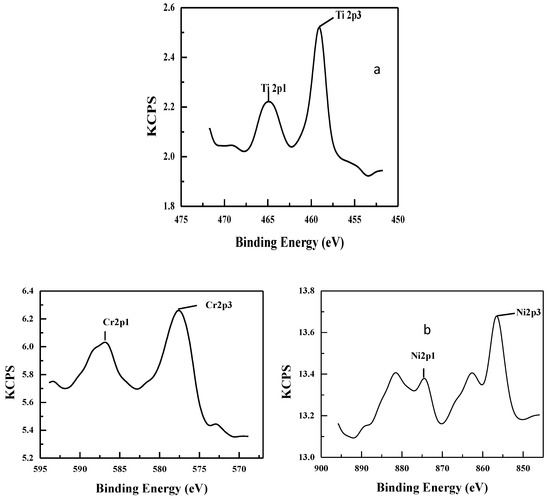 XPS patterns of (a) 2.9 wt% TiO2/SiO2-500; (b) 7.1 wt% Cr2O3-6.3 wt% NiO/SiO2-500; and (c) 1.4 wt% TiO2-6.1 wt% Cr2O3/SiO2-500.