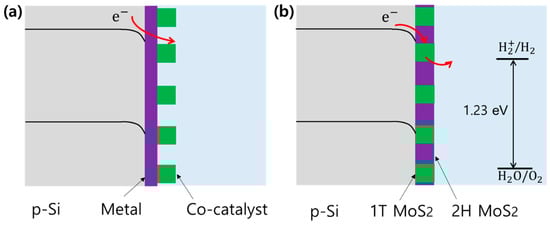 Moreover, in PEC where solid-state properties are concerned, the detailed device configurations of semiconductor-based photoelectrodes has progressed: (1) Utilizing a metal-insulator-semiconductor (MIS) Schottky junction structure with a cocatalyst has proven to enhance the overall performance by modulating the band bending at the semiconductor surface. Recent studies have shown that the photocatalyst layer on the semiconductor increases the band bending, affecting the resulting Vph [,]. The photocatalysts deposited on the semiconductor protect the surface from photocorrosion during an electrochemical reaction and secure chemically active/reaction sites on the surface, improving the charge transfer kinetics between the semiconductor and the solution. (2) To obtain a large Vph, a buried p-Si/n+-Si junction in a semiconductor has been employed. Kwon et al. grew MoS2 layers on SiO2, followed by transferring them to a Si substrate to form a p-n heterojunction, which exhibited a 24.6 m·Acm−2 Jph at 0 V vs. RHE with a 0.17 V onset potential []. Seo et al. produced an onset potential of 0.36 V for a silicon photocathode with surface functionalization combined with Pt []. Benck et al. fabricated a silicon buried p-n junction with MoS2 as the cocatalyst and showed an onset voltage of 0.32 V []. The presence of interfacial oxides, such as native SiOx, not only provides the passivation for semiconductor surface states but also alleviates Fermi level pinning effects []. Despite the synergetic roles of interfacial oxides in water splitting, the direct deposition of materials with a high on Si/SiOx causes stability issues for long-term operation. (3) Researchers have demonstrated that the introduction of series-metal thin films, such as metal silicides, between Si and cocatalysts improved the stability. A Stanford University group showed a stability of up to 100 h at 0 V vs. RHE by a thin MoxSi and Mo layers on a Si n+p junction. Fan et al. additionally introduced thin Al2O3 layers on a Si junction to improve the stability from photocorrosion []. Although an amorphous Si-based photocathode with a high Vph of 0.8 V has been reported, this was attributed to the different band gap of 1.7 eV [].