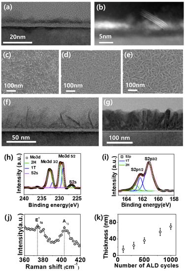 The overall morphologies (Figure 2c–e) and the resulting thicknesses (Figure 2a,b,f,g,k) of MoS2 on Si surfaces were reproducible as previously reported []. The layered-structural nature was shown by the Raman spectra (Figure 2j), and the mixed-phase (1T and 2H) structures were also observed via XPS spectra (Figure 2h,i). Initial cycles up to 100 ALD cycles resulted in several MoS2 nanoflakes (diameter of ~10 nm). Most of the nuclei layers have parallel basal planes to the substrate surfaces, as shown in Figure 2a,f. The TEM of 300-cycled MoS2 shows more vertically grown MoS2 layers on the p-Si, as shown in Figure 2f. This growth mechanism was observed in thicker layers (1000 cycles in Figure 2g) and was identical to earlier work by some of the authors [].