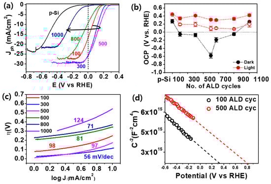 PEC performance of p-Si/SiOx/MoS2 photocathodes with different numbers of ALD Cycles. (a) Current density (Jph)—voltage (V) characteristic of the photocathodes under 1 sun illumination at a reverse bias. Anodic shifts of up to 0.35 V for the onset voltage (photocurrent onset of 0.1 mA·cm−2) were observed at approximately 500 cycles of ALD with a Jph of ~30 mA·cm−2. (b) Open circuit potential (OCP) measurement of our simple p-Si/SiOx/MoS2 photocathode for different MoS2 thicknesses in the electrolyte. Each sample’s OCP was recorded under dark and with 1 sun illumination. Red and black closed circles represent illumination and dark equilibrium, respectively. Red open circles are saturated voltages. The OCP shifted from positive to negative upon illumination, indicating the p-type property of the substrate. As the thickness increased, the flat-band potential increased from 0.11 ± 0.02 V (p-Si), and the maximum was obtained at 500 cycles for MoS2, which was 0.8 to 0.67 V, as highlighted in the blue shadow. (c) Tafel curves of p-Si/SiOx/MoS2 of different number of ALD cycles. (d) Mott-Schottky plots of the p-Si/SiOx/MoS2 photocathode measured at reverse biases with a frequency of 200 kHz and a scan rate of 10 mV·s−1. The effective barrier heights of ~0.8 and 0.4 eV were estimated for 500 and 100 cycles, respectively.