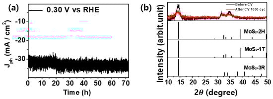 Indeed, our p-Si/SiOx/MoS2 photocathodes regulated the overall energy barriers and impedances of the total junctions. Accordingly, the stable operation under 1 sun illumination at a −0.3 V reverse bias and 0 V vs. RHE is shown in Figure 4a. The stable operation is due to the secure chemical contact formed between the p-Si/MoS2 interface due to the ALD deposition method, which conformally deposited the layer on the silicon surfaces. Ding et al. experimentally confirmed the effect of a higher quality interface for 1T-MoS2/Si by comparing the PEC characteristics of drop-casted 1T and CVD-grown 1T MoS2 films, showing improved performance with a 0.235 V vs. RHE onset potential for the CVD-grown MoS2 film on Si []. The metallic nanojunctions in our mixed-phase (1T and 2H) MoS2 layers grown via ALD improved the stability for HER by reducing the contact resistance to Si. Upon stable operation of the p-Si/SiOx/MoS2 photocathode for 70 h under light, the resulting samples were analyzed by XRD, as shown in Figure 4b. Accordingly, the overall structures remained unchanged.