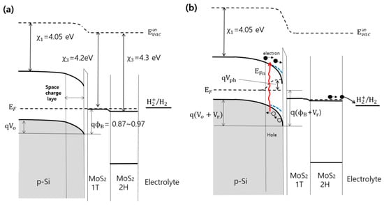 The ALD deposited MoS2 layers gradually alleviate the FLPss effect, and at the same time forming a bulk heterojunction interface. Considering the semiconductor p-n heterojunction utilized in PEC process, there are two types of Vph values. One is at the p-n junction interfaces, and the second is on the surfaces, which are MoS2/electrolyte interfaces []. It is confirmed in our previous study that our MoS2 is insensitive to light (i.e., high doping concentrations). It is concluded then that the driving potential for the generated electron-hole pair separation and p-n junction interface-dominated Vph. Now, considering the p-n heterojunction part in the p-Si/MoS2, the built-in potential can be expressed by conventional solid-state physics in Equation (4) [],
