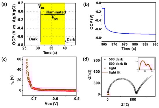 The open circuit potential (OCP) difference between dark and light directly indicates the Vph observed, the amount of the band bending of the junction interfaces (Figure 6). Upon illumination, the amount of the Fermi level shift (Vm) is 0.8 V by observing a very sharp increase in the OCP as shown Figure 6a. This is distinctive in that typical PEC cells exhibit gradual increments when light turns on. The subsequent saturation is attributed to the recombination at the electrode/electrolyte interface, which results in 0.67 V (Vss). Considering the physical dimension of metallic 1T MoS2 of approximately 10 nm, which is much smaller than the depletion width, environmental Fermi level pinning (FLPnS) is expected by nano-Schottky junctions of p-Si/1T MoS2 although the surface states (FLPss) were passivated. Moreover, FLPnS competes with both FLDPox and FLDPox followed by pinch-off, enabling effective tuning of the Schottky barrier, which results in the final value of the effective barrier height of 0.8 V (Vm). By observing a sharp increase in OCP, indeed, fast transient behavior occurred when light turns on, implying that FLP is negligible in the present electrochemical reactions. The OCP decay after turning off the light provided information on the generated electron-hole pair recombination at the electrolyte interface and the carrier lifetime as shown in Figure 6b,c. The hole lifetime from the voltage decay is given by Equation (6) [].