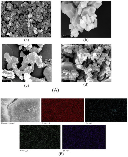 FESEM images of (A) (a) ZIF-8 (b) 2Cu/ZIF-8N4 (c) 2Cu/ZIF-8N3 (d) 2Cu/ZIF-8N2 and (B) dot mapping images of 2Cu/ZIF-8N2.