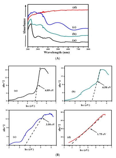 UV-vis optical absorption spectra of the materials recorded within the region from 200 to 800 nm are shown in Figure 3A. 2Cu/ZIF-8 based materials exhibit a systematic increment in the absorption intensity with a relative decrement in ammonium hydroxide concentration. The 2Cu/ZIF-8N2 shows extensive absorption peak in the visible region as compared to the other materials. In Figure 3(Ad), 2Cu/ZIF-8N2 appeared in the ultraviolet range with a sharp peak at 330 nm. The 2Cu/ZIF-8N2 shows extensive absorption peak in the visible region as compared to the other materials and the same observation were characterized by Chary et al. [36]. The origin of the broad absorption peak in the visible region is might be due to the interaction of 2M concentration of ammonium hydroxide solvent with Cu/ZIF-8. The absorption peak in 2Cu/ZIF-8N2 sample at 330 nm shows a strong interaction of N-Cu-N cluster formation, signifying the highly dispersed form of copper. Apart from that, two more absorption shoulders were observed in the current study. An absorption peak centered at 520 nm with energy band gap of 2.38 eV suggested the presence of Zn2+. Similarly, the absorption band around 710 nm with energy band gap of 1.75 eV was assigned to 2Eg → 2T2g transitions of Cu2+, indicating octahedral symmetry of Copper. Moreover, this absorption band was also attributed to the crystalline phase of copper and d-d transitions of copper (II) ion. The bandgap of the developed catalysts is used to explore the effect of ammonium hydroxide concentration using Tauc’s plots as depicted in Figure 3B. In Tauc’s plot, h is Planck’s constant, υ is frequency and α is absorption coefficient [37]. The decrease in NH4OH concentration from 4M to 2M resulted in the decrease of bandgap energy from 4.58 eV for 2Cu/ZIF-8N4, 3.50 eV for 2Cu/ZIF-8N3, 1.75 eV for 2Cu/ZIF-8N2. As shown in Figure 3B, the bandgap value decreased from 4.89 eV to 1.75 eV with the addition of copper into ZIF-8 that shows smaller bandgap rather than stated by Schejn et al. [22]. Hence, it proved that the UV region of host ZIF-8 (4.89 eV) can be affected with the addition of copper and different ratio of NH4OH solvent. It is concluded that 2Cu/ZIF-8N2 exhibits a sharp edge at 1.75 eV activating the visible region of the photocatalyst. The shift in a peak in Figure 3A depicts a strong interaction between the copper metal and ZIF-8 framework. ZIF-8 and 2Cu/ZIF-8N4 present a narrow absorption profile in the visible region compared to other two 2Cu/ZIF-8 materials. The bandgap of ZIF-8 reduced after inclusion of copper on it and shifted to lower bandgap energies with more absorbance and become active in the visible region. The results suggested that 2Cu/ZIF-8N2 can be photoexcited to create more electron−hole pairs under visible light absorbance which could lead to higher photocatalytic efficiency [28,38].