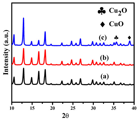 XRD spectra of (a) 1Cu/ZIF-8N2 (b) 2Cu/ZIF-8N2 (c) 3Cu/ZIF-8N2.