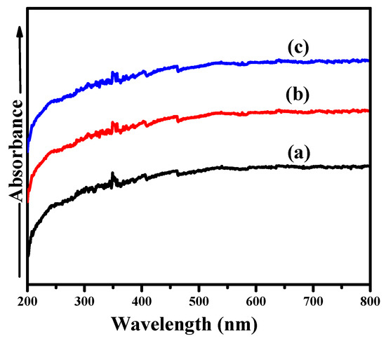 The optical absorbance spectra of all Cu/ZIF-8N2 catalysts with different amount of copper loading were examined by UV-vis spectroscopy as can be seen in Figure 6. An extensive absorption spectrum can be observed for each sample. It can be found that ZIF-8 has a low absorbance in the visible region. After copper was loaded and increased consistently, the absorbance of the all Cu/ZIF-8N2 materials developed more intense in the visible region (λ > 400 nm). It is evident that there is no ending of spectrum in the visible region of all catalysts. Zhang et al. [42] studied the increment in the visible region after deposition of the metal onto the support surface. The UV-vis spectra clearly indicate that the absorption of a metal particle onto the support surface enables it to participate in the photocatalytic reaction. The formation rate and the number of electrons and holes on the surface of the photocatalyst correlate significantly with the absorbance of visible light [43]. The band gap energies of the Cu/ZIF-8N2 catalysts are mentioned in Table A1.