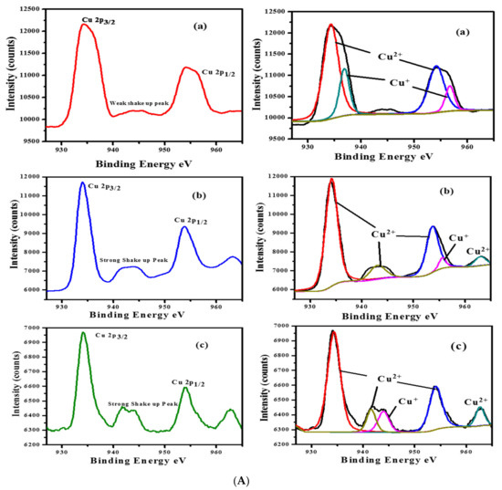Furthermore, the elemental analysis was performed by XPS to confirm the loading of Cu (II) ion onto the ZIF-8 surface for each Cu/ZIF-8N2 catalyst. The spectrum in Figure 7A shows that the Cu 2p3/2 and Cu 2p1/2 peaks are located at approximately 934 eV and 954 eV, respectively, with a shake-up peak at ~943 eV for all materials. The existence of these peaks confirms the presence of Cu2+ in the catalyst [44]. It is well reported that Cu may exist in the form of CuO [45,46]. Whereas, in the present study, it was observed that Cu is linked with a nitrogen atom of ZIF-8 which is also confirmed with FTIR spectra (Figure S2).