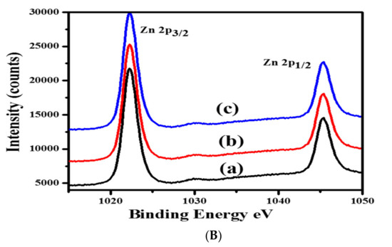 The peak fitted graph is combined with the Cu2p graphs in order to show the presence of Cu2+ and Cu+ ions as shown in Figure 7A. The spectra show that 2Cu/ZIF-8N2 possess the higher concentration of Cu2+ as compared to Cu+. Whereas, other two catalysts exhibit comparatively higher concentration of Cu+ which lead to lower photocatalytic activity. Another resolution spectra of Zn (II) ions is demonstrated in Figure 7B, represents two characteristics peaks at 1022.4 eV and 1045.3 eV correspond to Zn2p3/2 and Zn2p1/2, respectively. These binding energies confirmed the presence of Zn (II) ions attached with nitrogen in the imidazole ring [47].