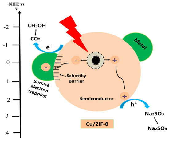 On the basis of our findings, it could be postulated that the addition of metal to a material can alter the surface properties and overall efficiency of a material. The incorporation of metals as a charge-carrier trap enhance the reaction rate and also increase the lifespan of separated electron-hole pairs [53,54]. During the photocatalytic reaction, the electrons move from lower to higher energy level to make balance and create a Schottky barrier [55]. The Schottky barrier serves as an electron trap which stops the migration of electrons from crossing back to the valence band (VB) and therefore inhibits recombination. It was predicted that the electrons generated in the conduction bands (CB) of the Cu/ZIF-8 catalysts took place after the irradiation of visible light. This could separate the photogenerated electron–hole pairs. When pure ZIF-8 was used, no methanol was produced, the generation of methanol could be due to the reaction of CO2 with protons and electrons (ECO2/CH3OH = −0.38 V) as reported [56]. A semiconductor has two main distinctive characteristics: firstly, a charge-separated state is generated when energy photons are greater than the bandgap of the material, used for the irradiation process and secondly, the mobility of the charge carriers. The charge carriers move away from the location where the separation of the charge occurs [55].