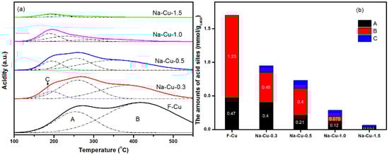 Figure 2b shows the acid contents of different catalysts. The fresh Cu/SSZ-13 showed the highest acidity among all catalysts. After the Na-impregnation process, the acidity declined and the reduction degree rose with increase amounts of introduced Na. When the Na loading reached 0.3 mmol/g, the desorption peak B assigned to Si-O(H)-Al bonds mainly decreased. Then, peak A, attributed to Cu2+ ions, declined when the Na loading was higher than 0.3 mmol/g. The total acidity decreased in the following order: F-Cu (1.7 mmol/g) > Na-Cu-0.3 (0.95 mmol/g) > Na-Cu-0.5 (0.73 mmol/g) > Na-Cu-1.0 (0.29 mmol/g) > Na-Cu-1.5 (0.06 mmol/g).